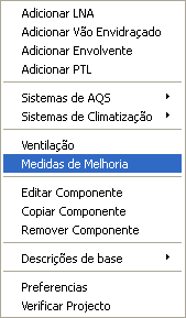 Para adicionar, editar ou remover uma medida de melhoria o utilizador pode utilizar o menu "Projecto->Fracção->Medidas de melhoria", através do botão direito do rato no painel Componentes e seleccionando o menu "Medidas de melhoria" ou ainda efectuando duplo clique sobre o componente medidas de melhoria.